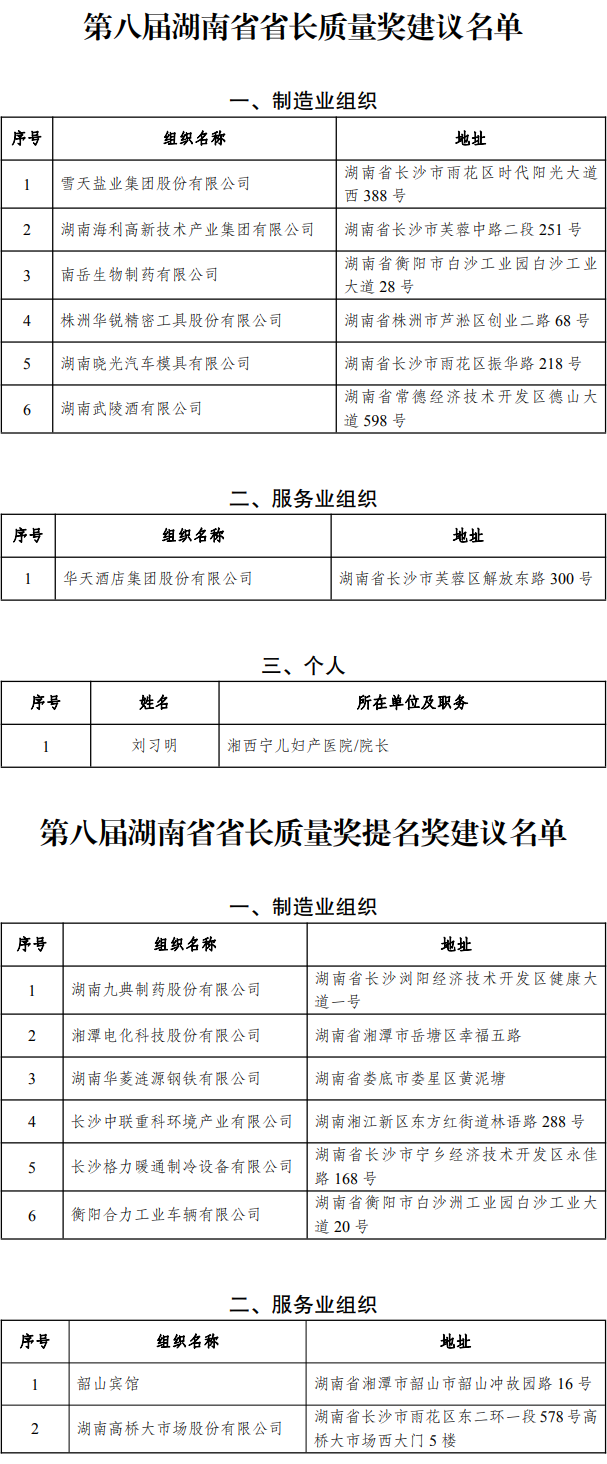 第八屆湖南省省長質(zhì)量獎(jiǎng)及提名獎(jiǎng)建議名單公示