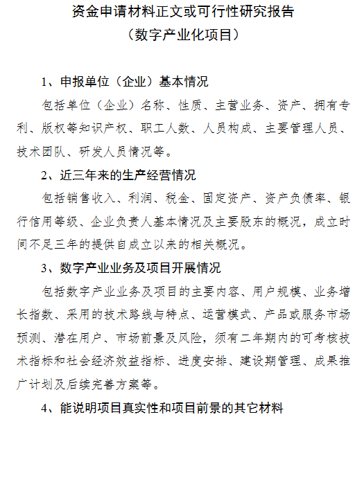 (1)數(shù)字產(chǎn)業(yè)化項(xiàng)目。申報(bào)主體為服務(wù)業(yè)企業(yè)的,要求2022年?duì)I業(yè)收入應(yīng)在1000萬(wàn)元以上、且當(dāng)年稅收在10萬(wàn)元以上,優(yōu)先支持規(guī)模以上企業(yè);申報(bào)主體為制造業(yè)企業(yè)的,應(yīng)為規(guī)模以上工業(yè)企業(yè)、且2022年稅收在100萬(wàn)元以上企業(yè),優(yōu)先支持具有兩化融合管理體系貫標(biāo)認(rèn)證資質(zhì)的企業(yè)。