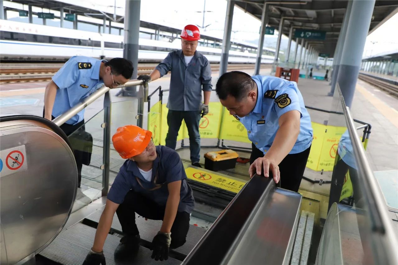 圖為市場(chǎng)監(jiān)管干部職工開展高鐵南站扶梯安全保障