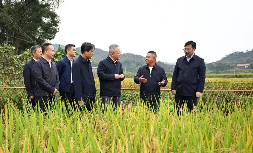 (10月9日,沈曉明在婁星區(qū)水洞底鎮(zhèn)鎘低積累水稻品種示范基地察看水稻長(zhǎng)勢(shì)。)